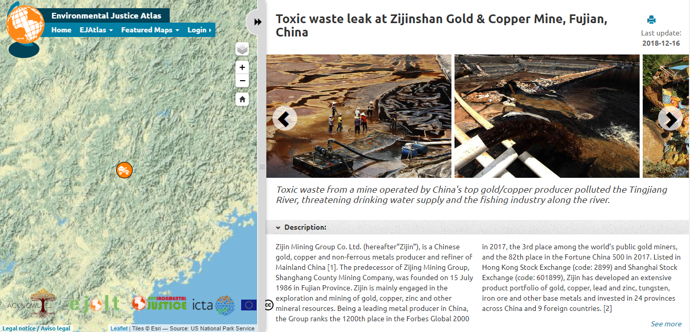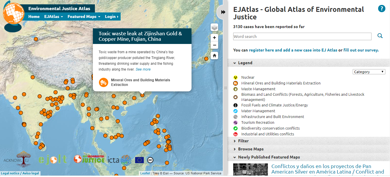 EJAtlas stands for “Environmental Justice Atlas” and is a simple tool developed by researchers from the Institute of Science, Technology and the Environment (ICTA) of the Autonomous University of Barcelona (UAB) in Spain as part of the EJOLT project. This tool documents environmental conflict claims in which there are environmental damages, or demands for access to environmental resources that are currently being denied to some marginalized groups. Each conflict has been documented by researchers and activists from around the world, creating a globalizing environmental justice movement.
