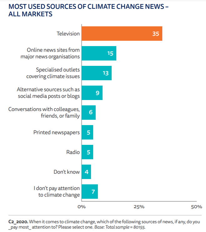The ‘good position’ Prof. Tapper was speaking of becomes more obvious when you ask people where they get their news on climate change. A Reuters Institute report published this year found that over half of people surveyed gather information on climate change through traditional news sources. The survey which had over 80,000 respondents from 40 countries found that 35% of people pay the most attention to climate change news on television, followed by online news sites 15%, and then printed newspapers and radio together accounting for 10% of responses.