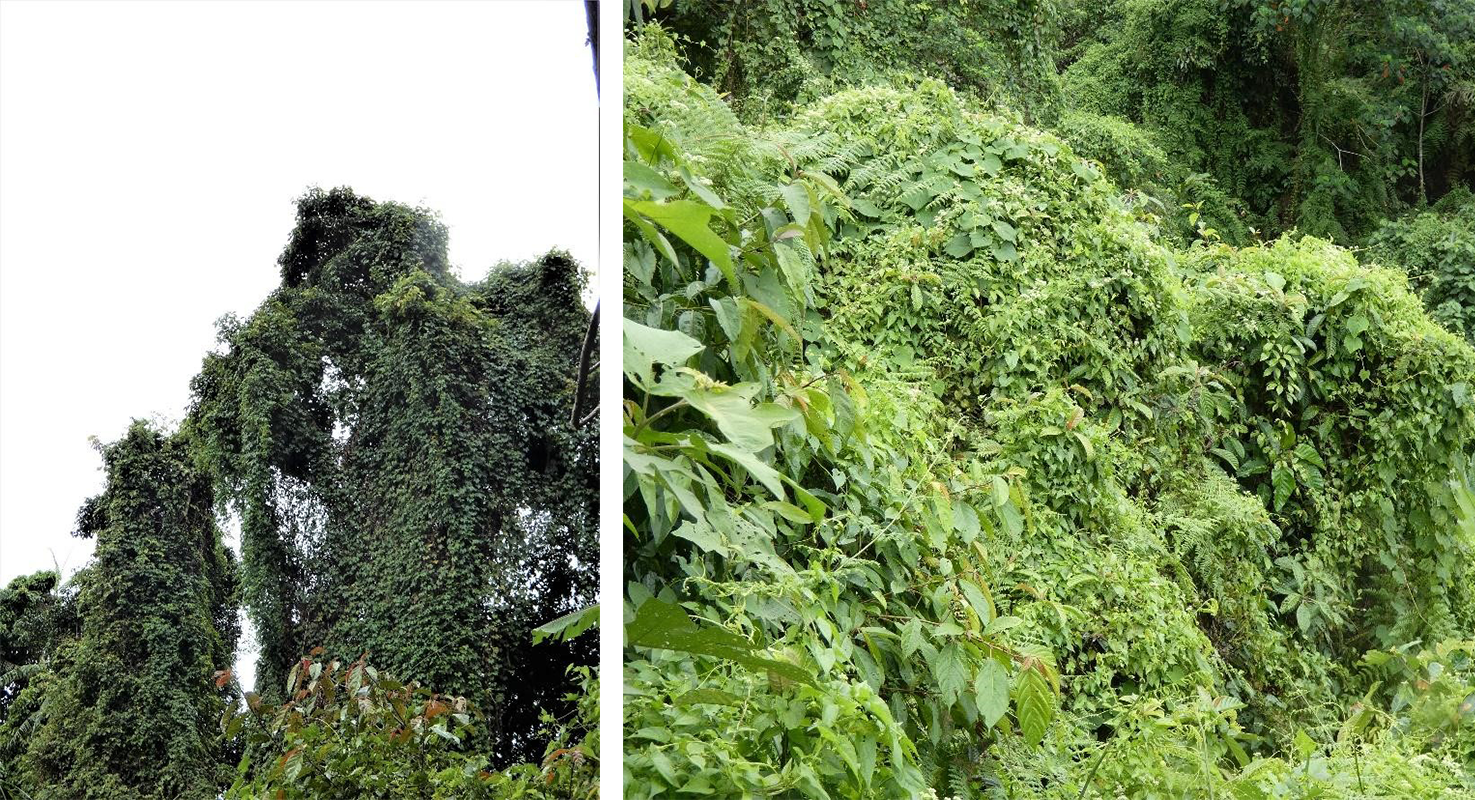 A combination of invasive and native vines choking young tress and preventing the canopy from being restored. These sites have remained in a state like this for several decades now, although the exact time of clearing is unknown.