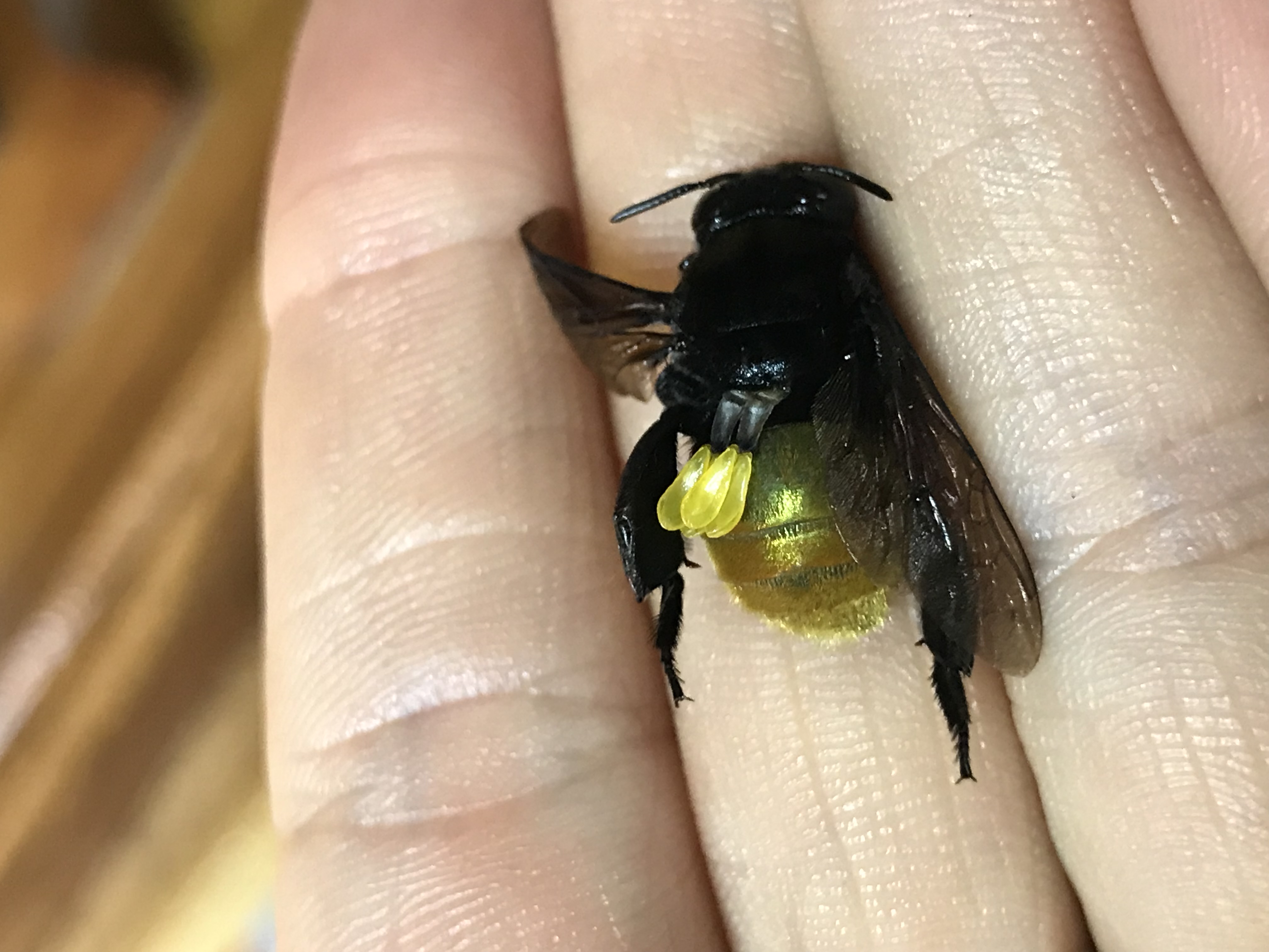 Orchid bee Eufriesea mussitans with pollen sacs stuck to his back.