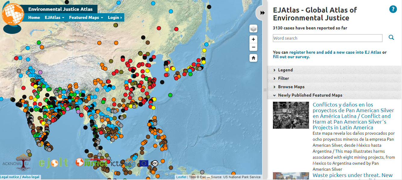EJAtlas stands for “Environmental Justice Atlas” and is a simple tool developed by researchers from the Institute of Science, Technology and the Environment (ICTA) of the Autonomous University of Barcelona (UAB) in Spain as part of the EJOLT project. This tool documents environmental conflict claims in which there are environmental damages, or demands for access to environmental resources that are currently being denied to some marginalized groups. Each conflict has been documented by researchers and activists from around the world, creating a globalizing environmental justice movement.